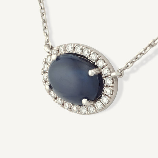 18K White Gold Cabochon Sapphire Necklace with Natural Cabochon Sapphire and Diamonds