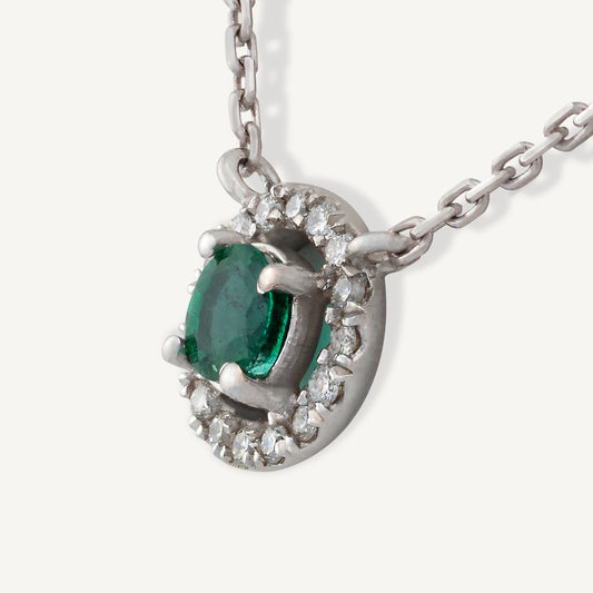 18K White Gold Green Oasis Halo Necklace with Natural Green Emerald and Diamonds