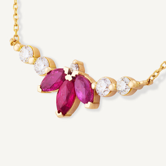 18K Yellow Gold Ruby Flower Necklace with Natural Red Rubies and Diamonds