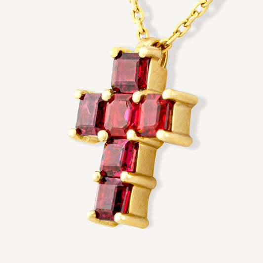 18K Yellow Gold Ruby Cross Necklace with Natural Red Rubies