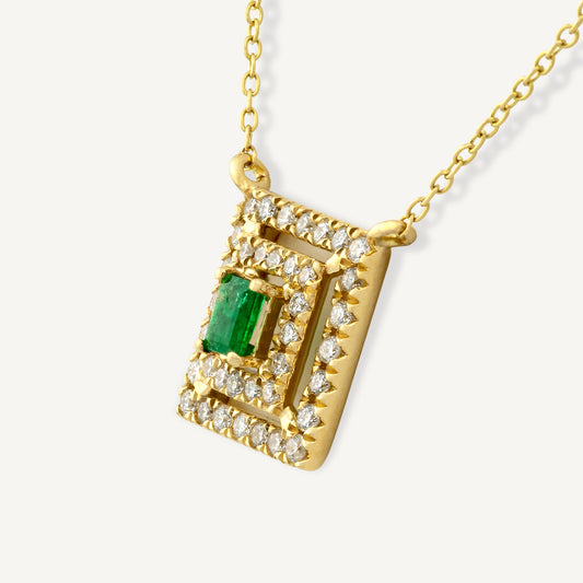 18K Yellow Gold Evergreen Emerald Frame Necklace with Natural Green Emerald and Diamonds