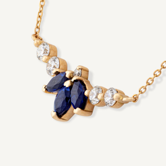 18K Yellow Gold Marquise Sapphire Symphony Necklace with Natural Blue Sapphires and Diamonds