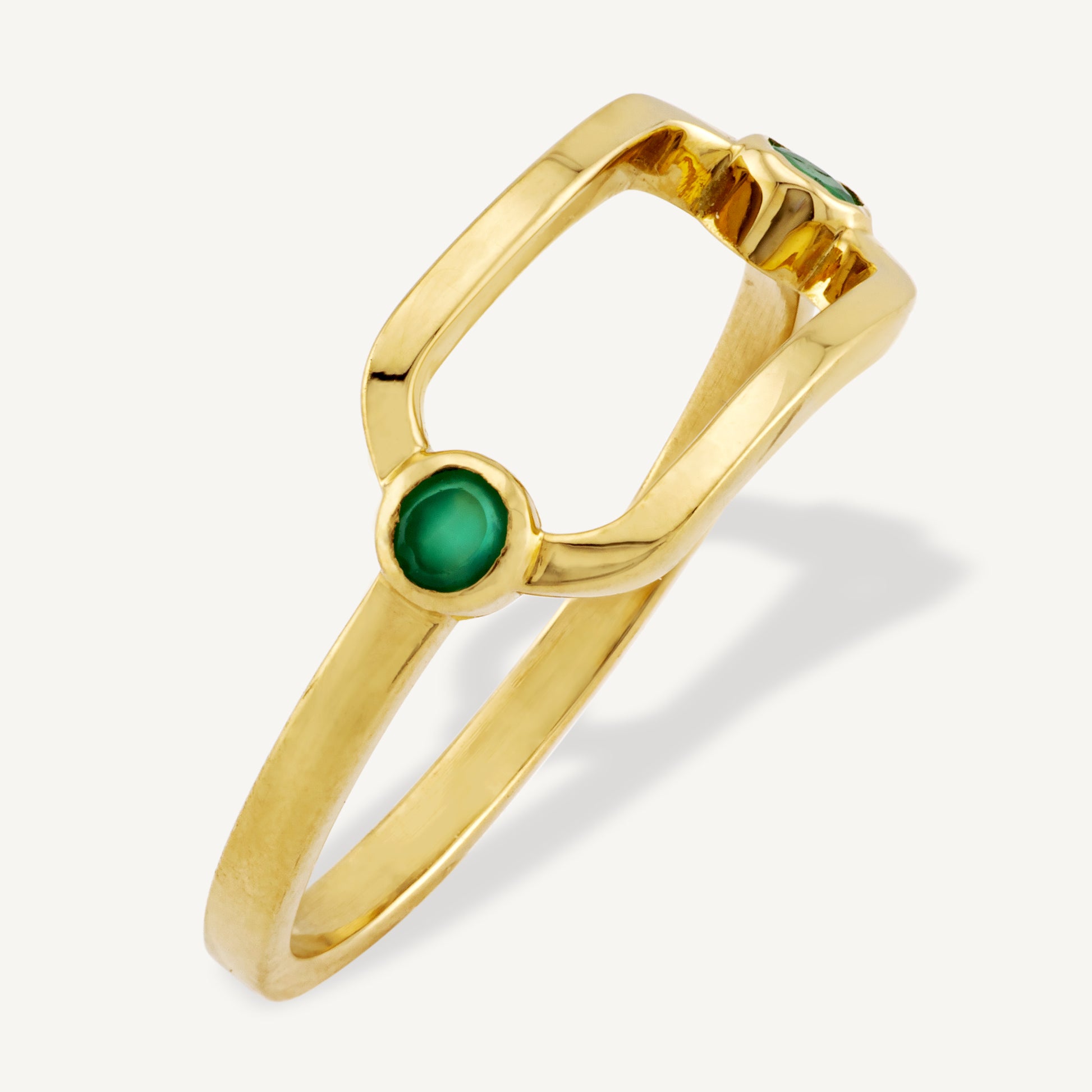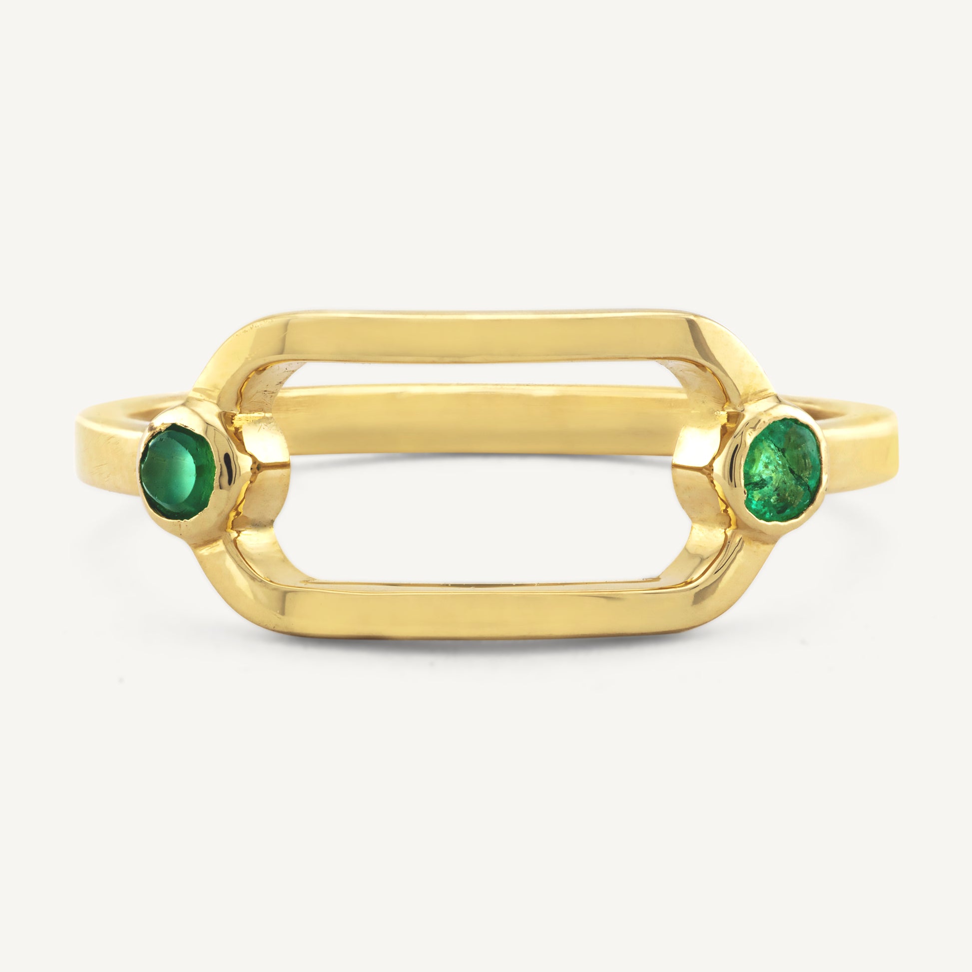 The 18K Yellow Gold Double Emerald Ring features two stunning natural emeralds elegantly set within a sleek rectangular band of lustrous yellow gold. With its modern design, this ring adds a luxurious touch to any ensemble, radiating sophistication and charm.
