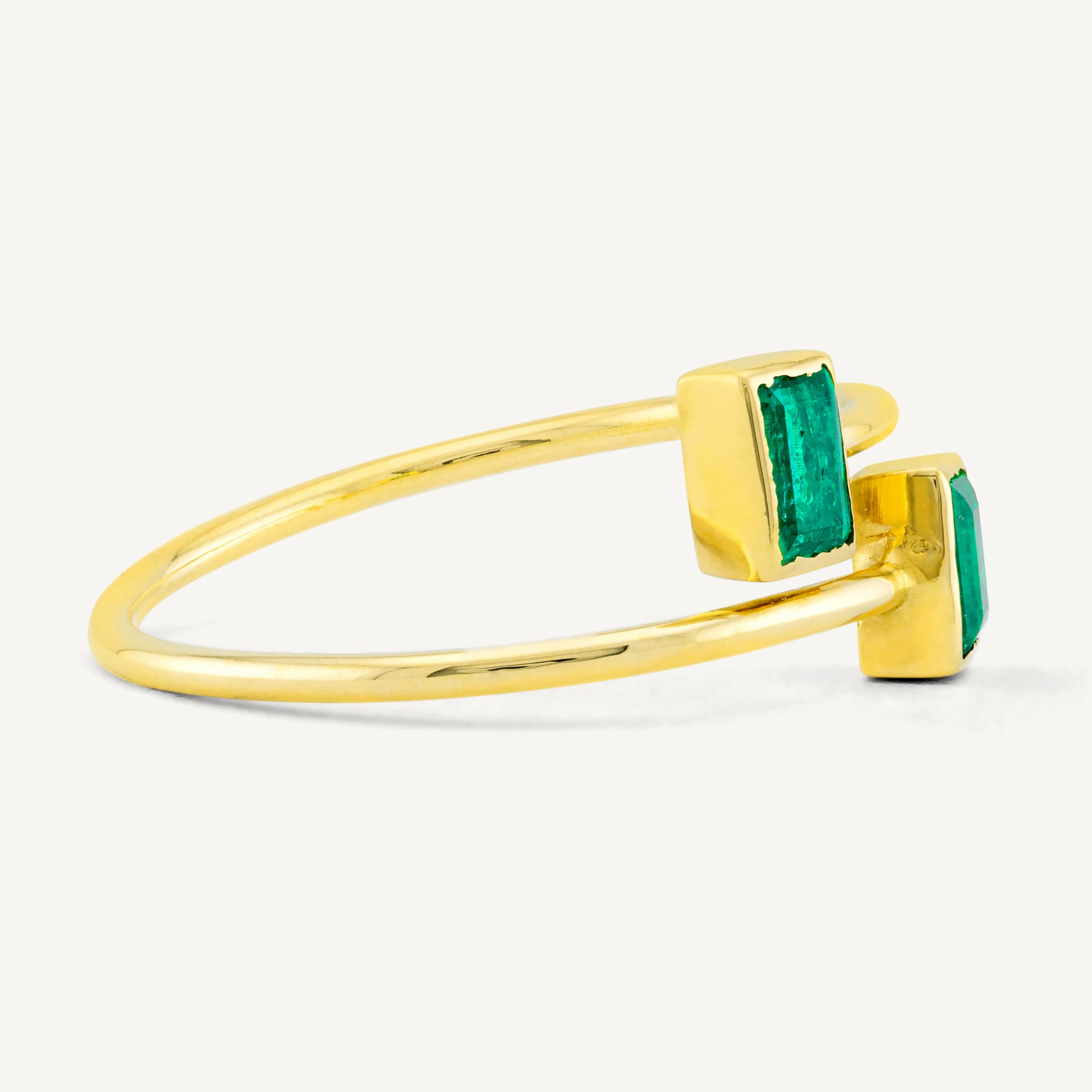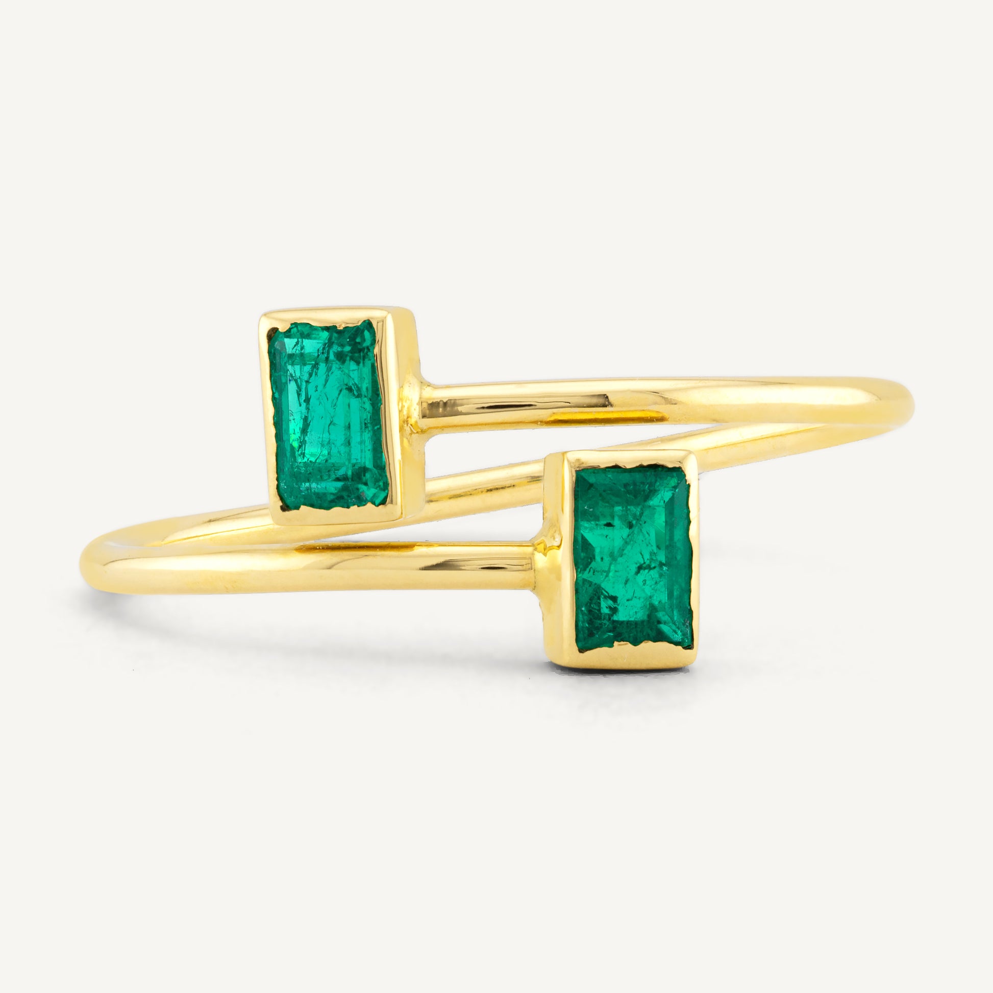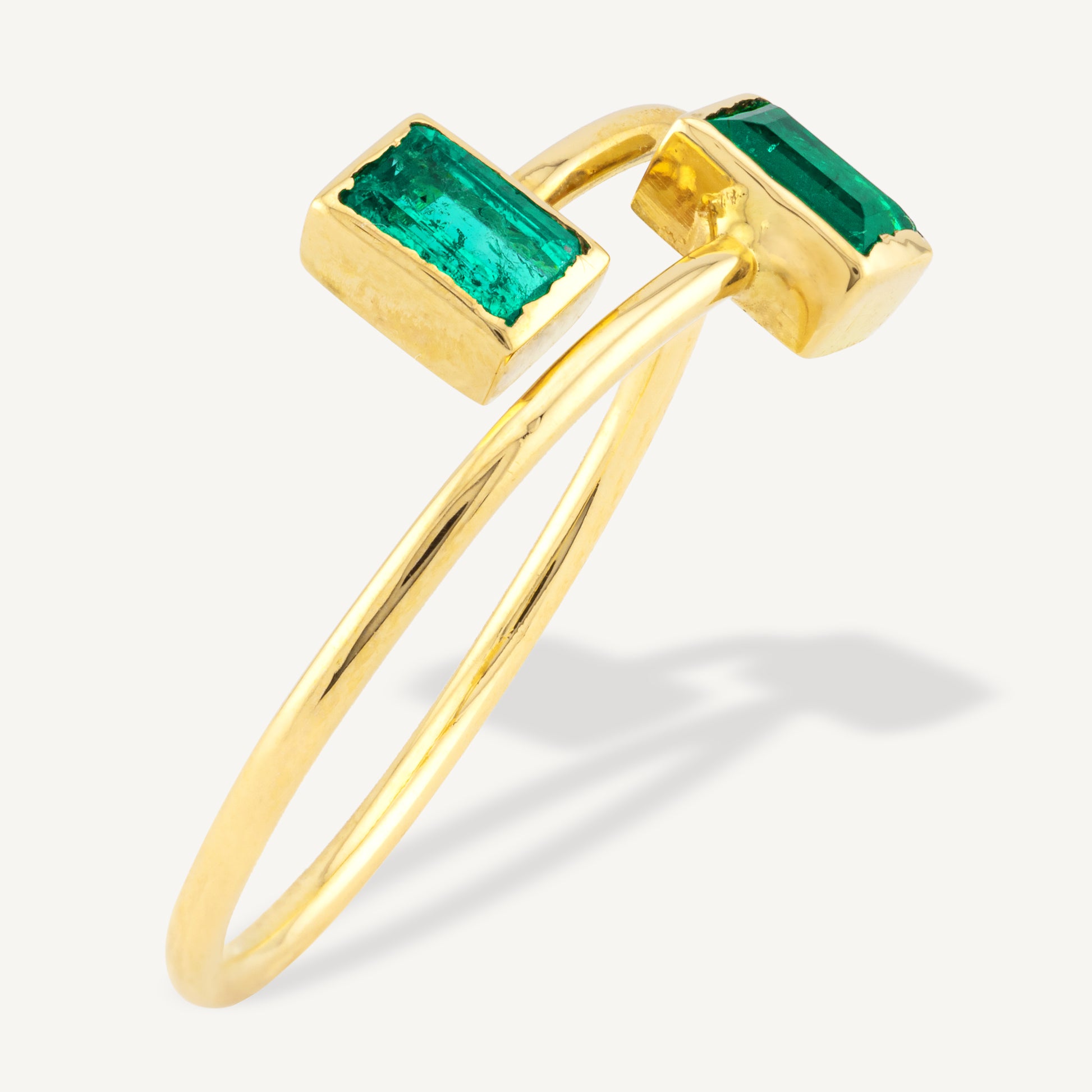 The 18K Yellow Gold Evergreen Emerald Ring features two vibrant natural emeralds, elegantly set in a beautifully crafted band of lustrous gold. This exquisite design radiates luxury and timeless beauty, making it a stunning addition to any jewelry collection.
