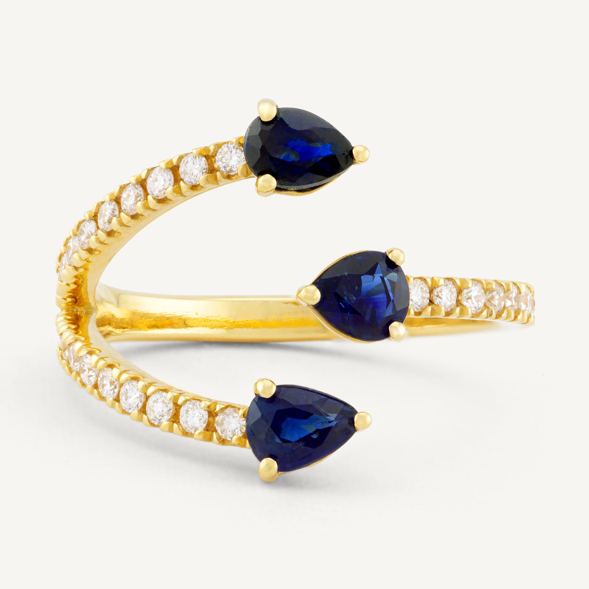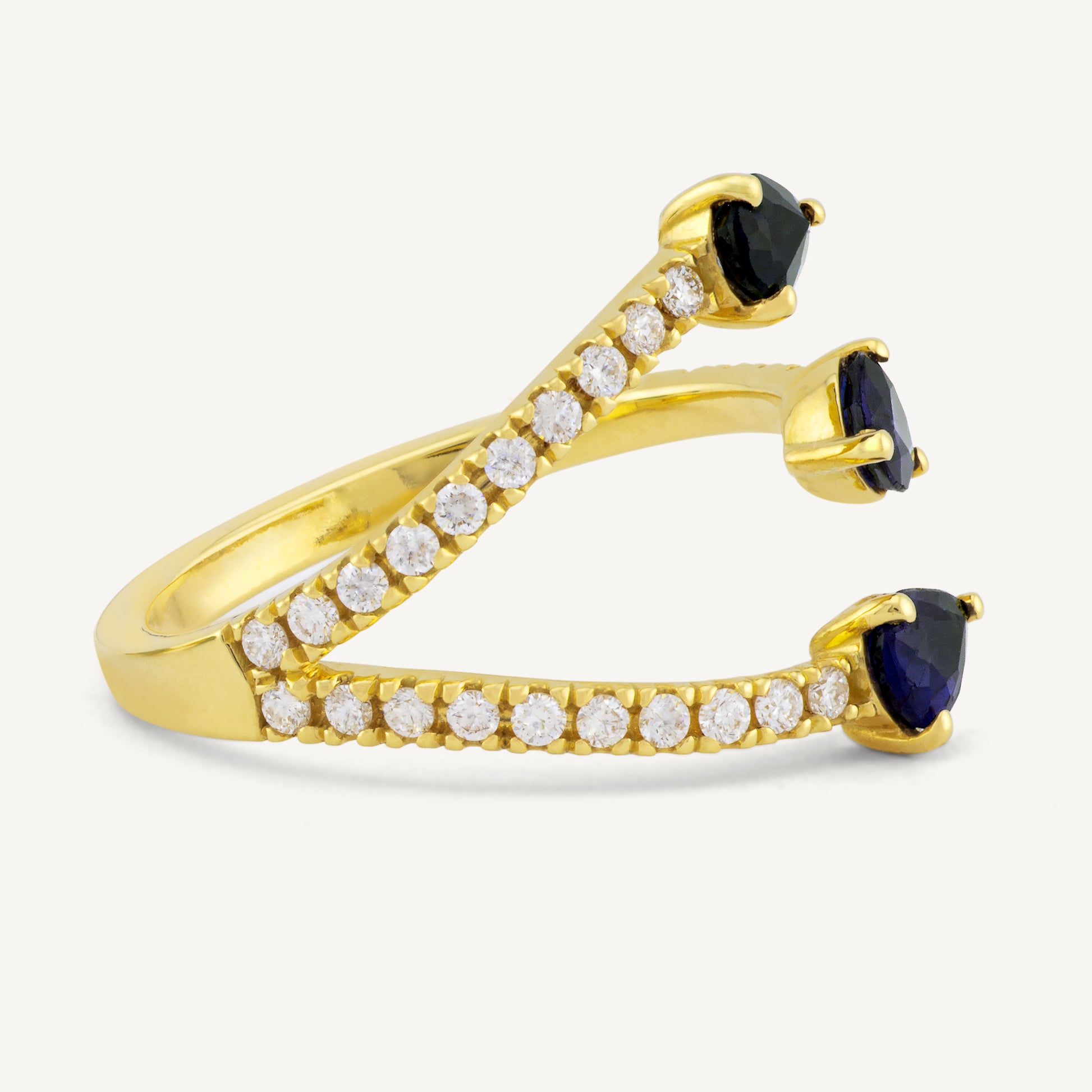 The 18K Yellow Gold Midnight Sapphire Trio Open Ring features three radiant natural sapphires, beautifully accented by sparkling diamonds and set in lustrous yellow gold. With its refined design and timeless elegance, this ring brings a captivating charm to any ensemble.