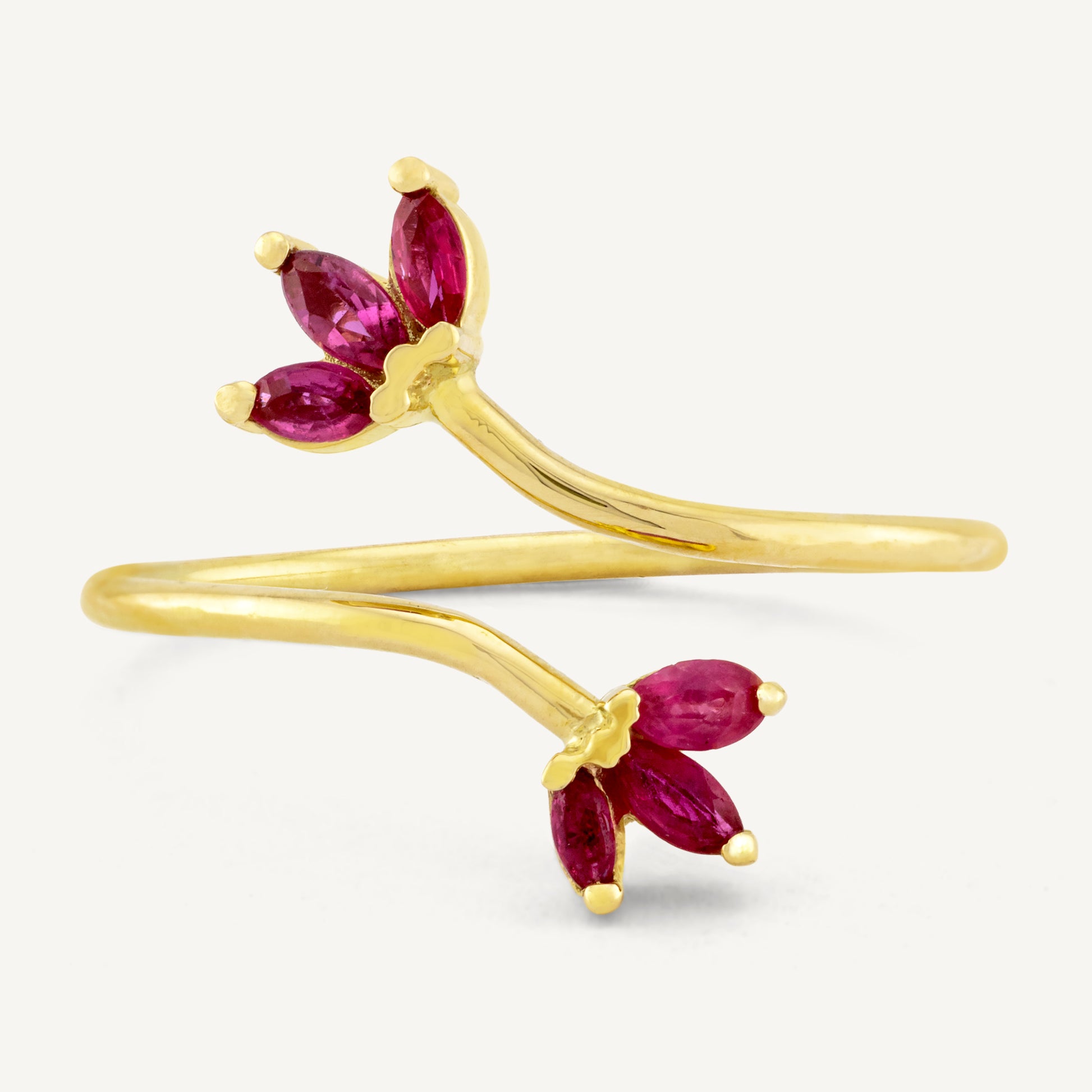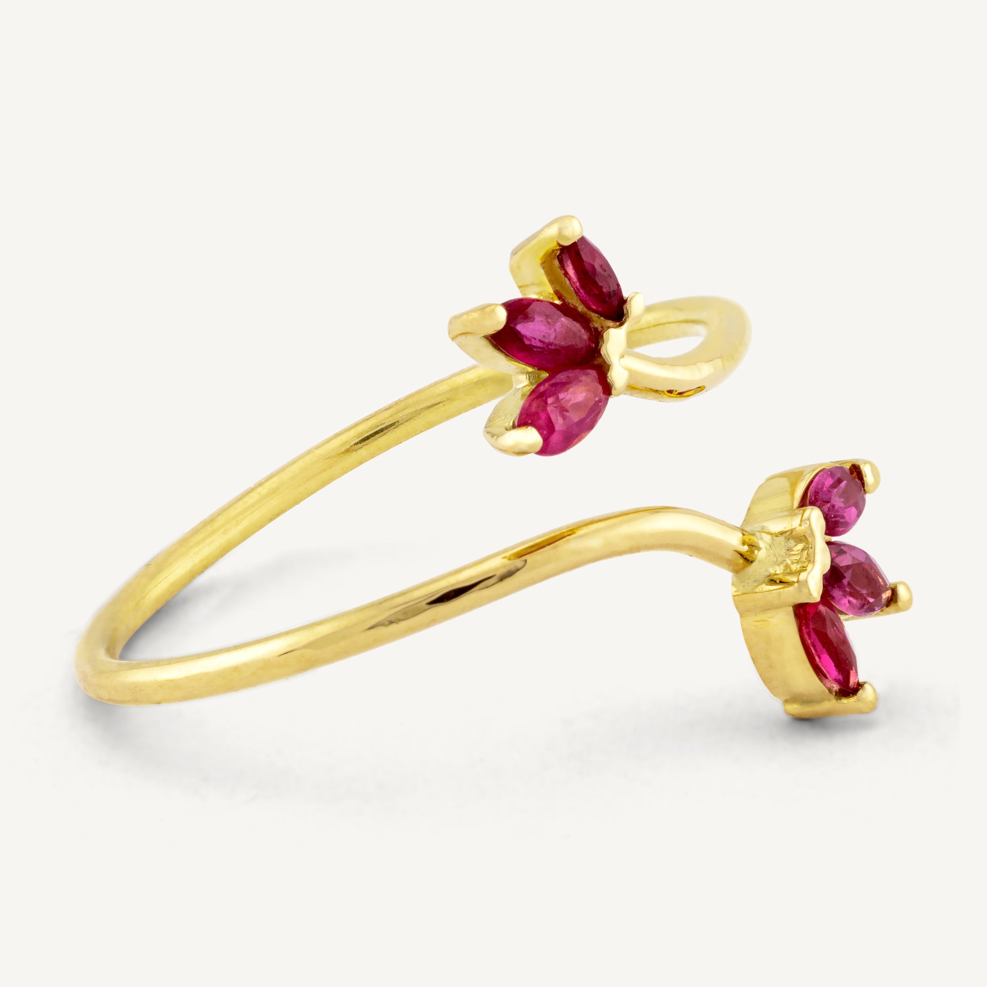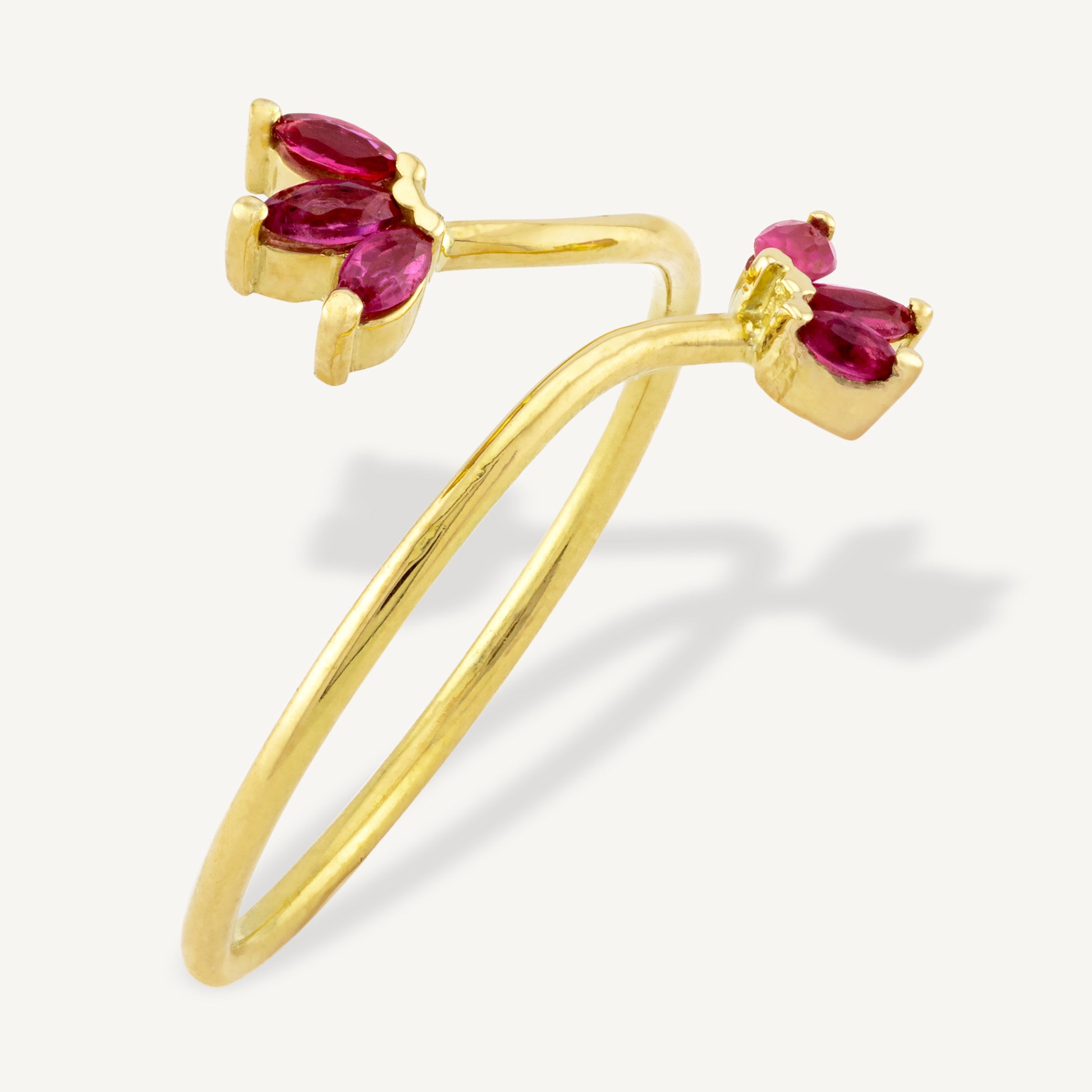 The 18K Yellow Gold Petaled Ruby Open Ring showcases a unique design featuring vivid petal-shaped rubies that elegantly intertwine. With its modern elegance and luxurious appeal, this stunning gemstone ring enhances any outfit, making it a perfect statement piece for any occasion.