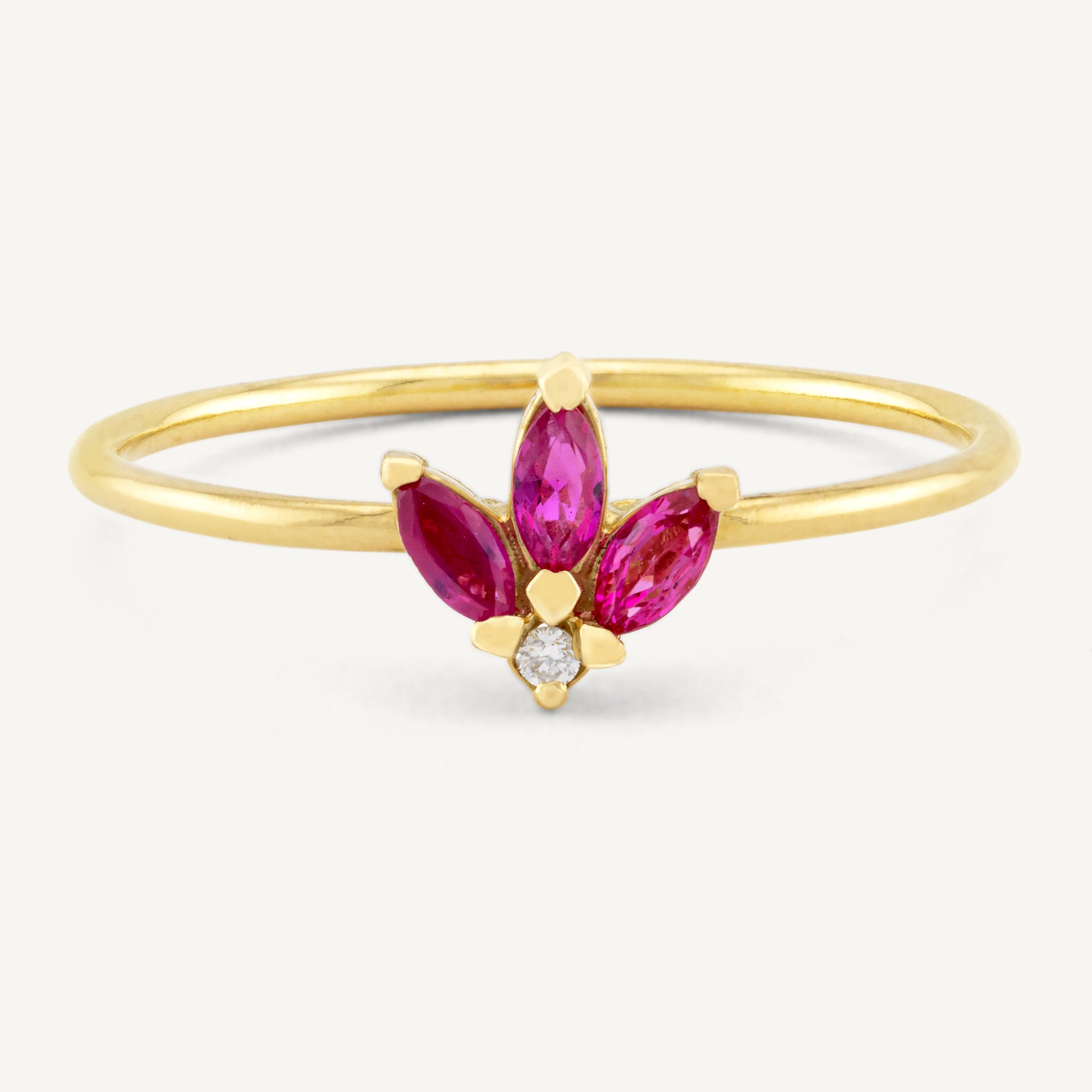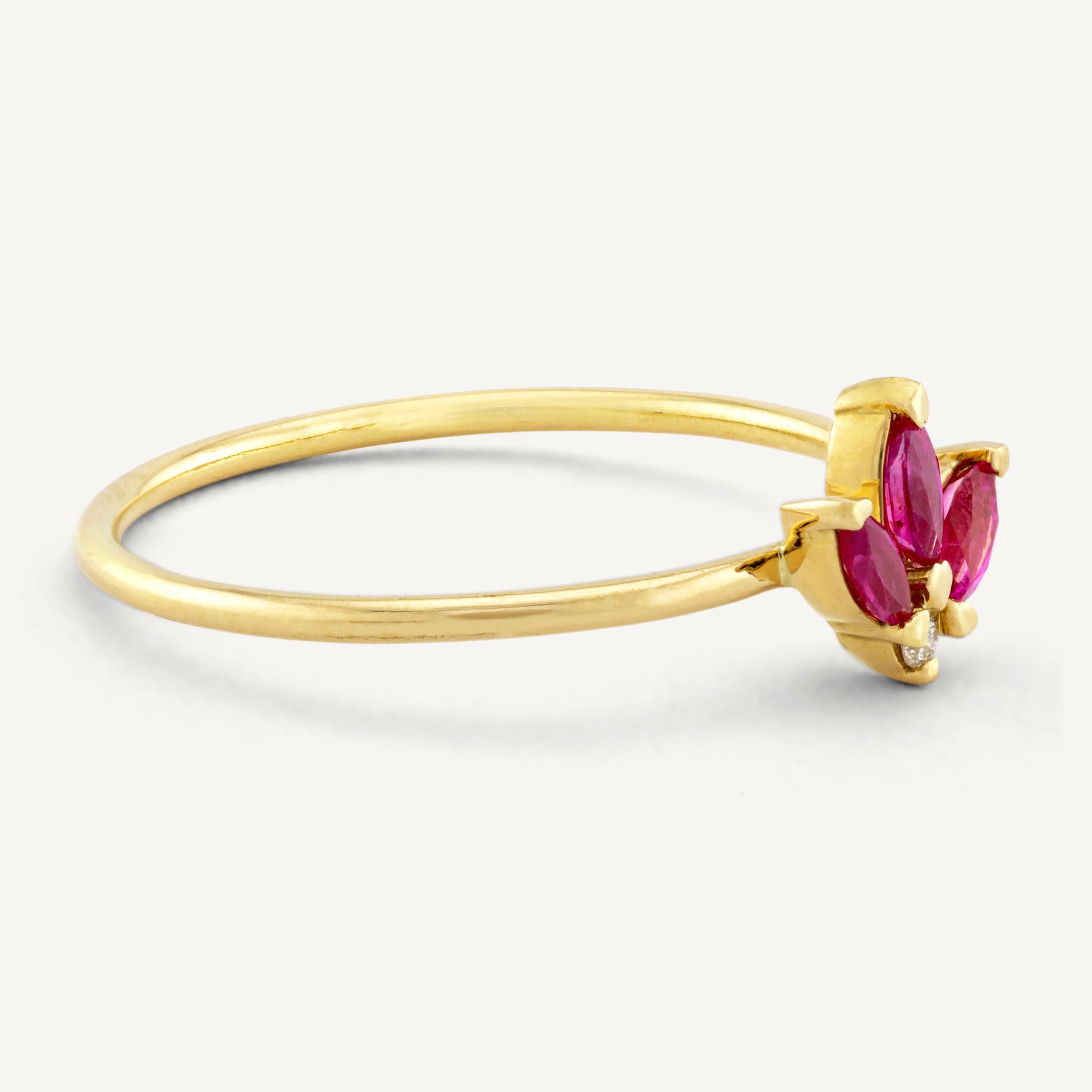 The 18K Yellow Gold Petaled Ruby Ring features a stunning arrangement of exquisite rubies artfully set in lustrous gold. With its modern design, this ring adds a touch of bold elegance to any ensemble, making it a standout piece for any occasion.