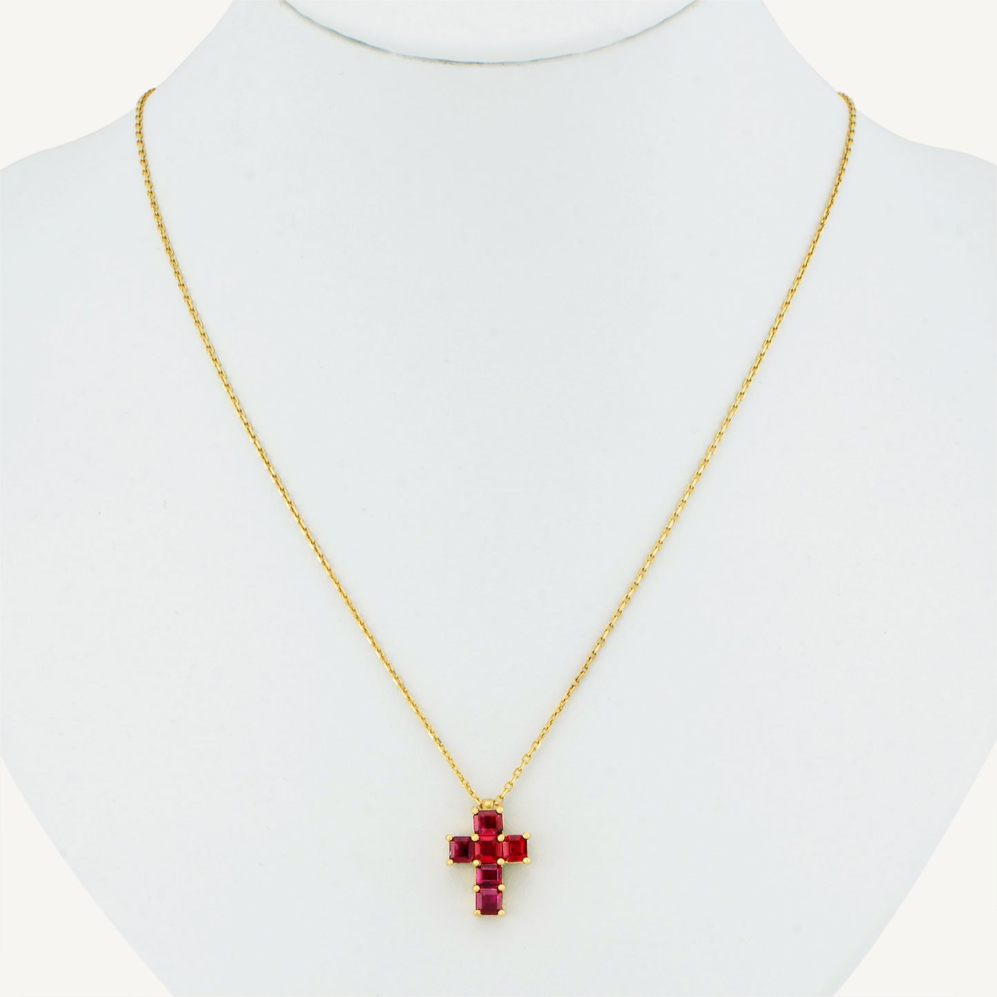 The 18K Yellow Gold Ruby Cross Necklace showcases vibrant red rubies, meticulously set within a beautifully crafted cross design. This elegant piece symbolizes faith and beauty, adding a timeless touch to any outfit.