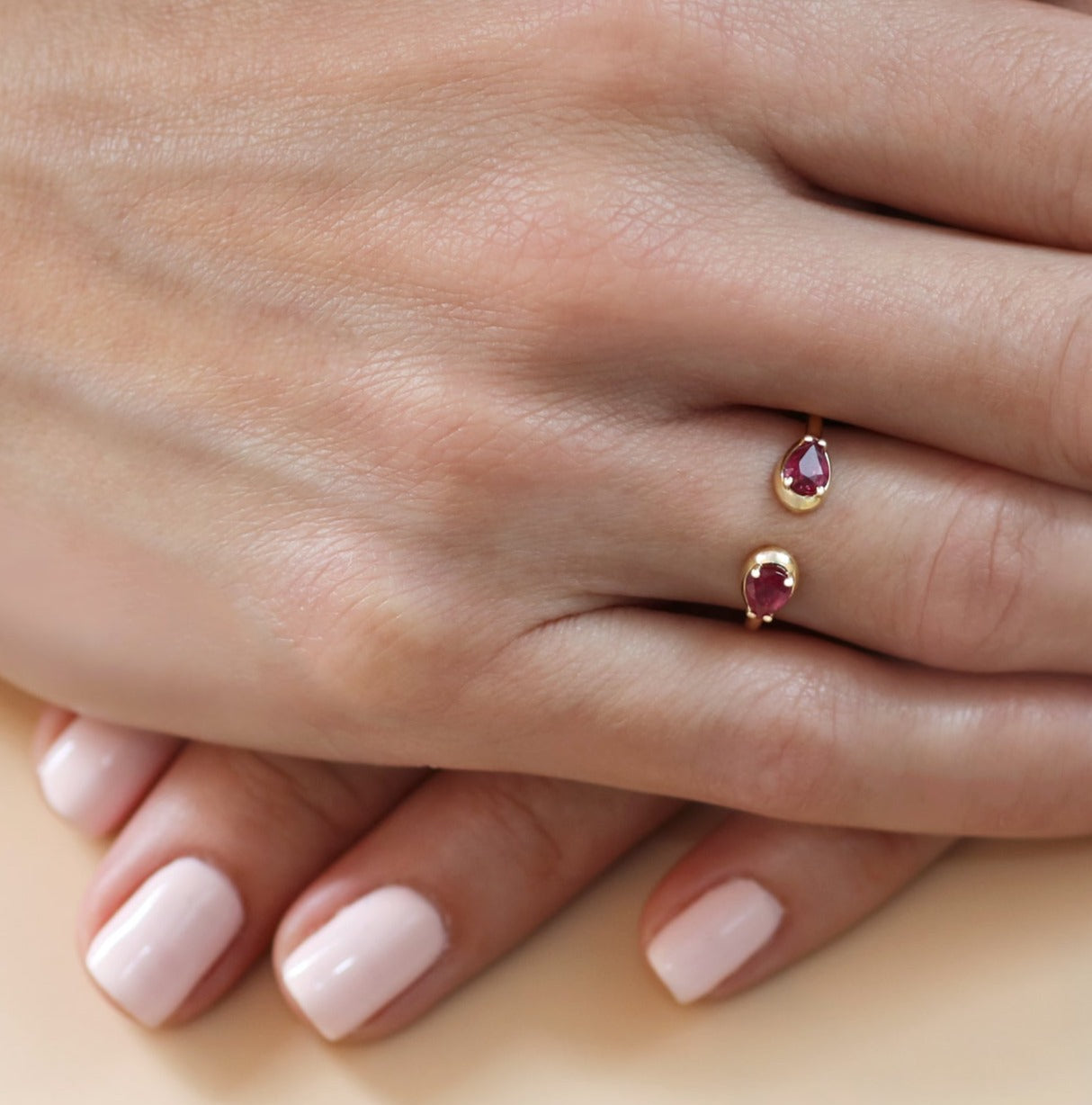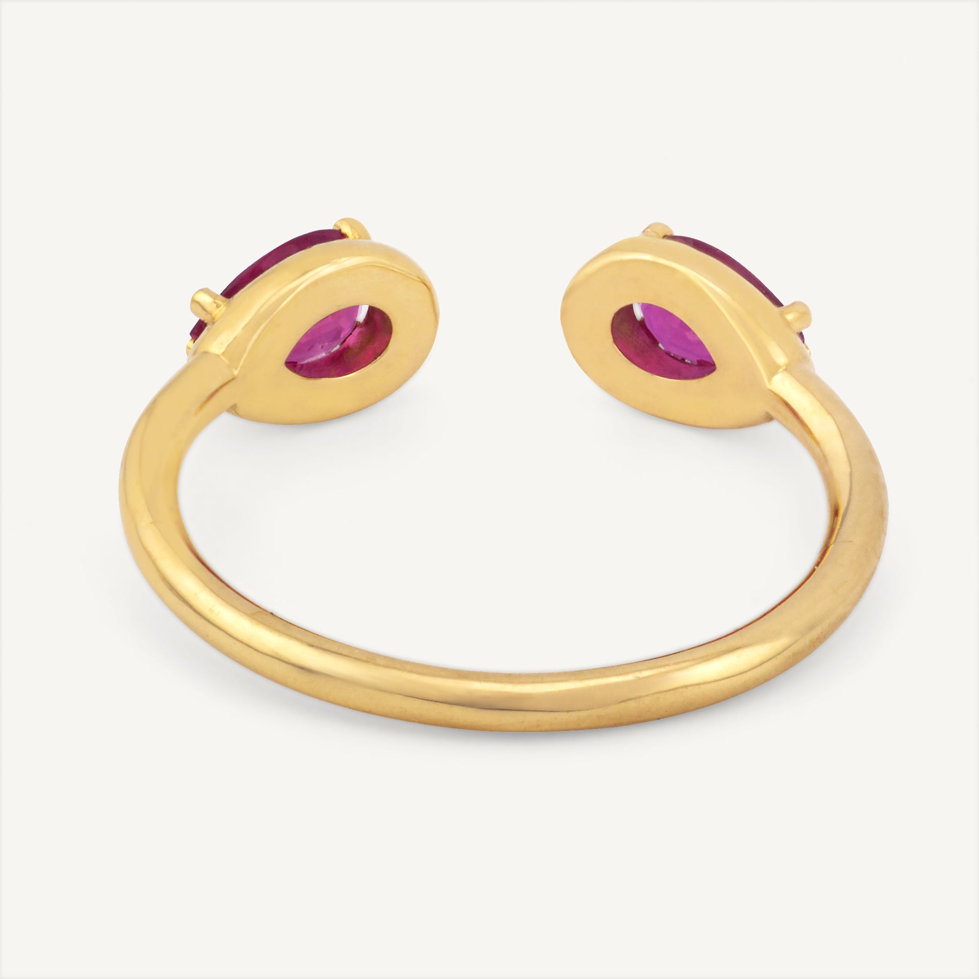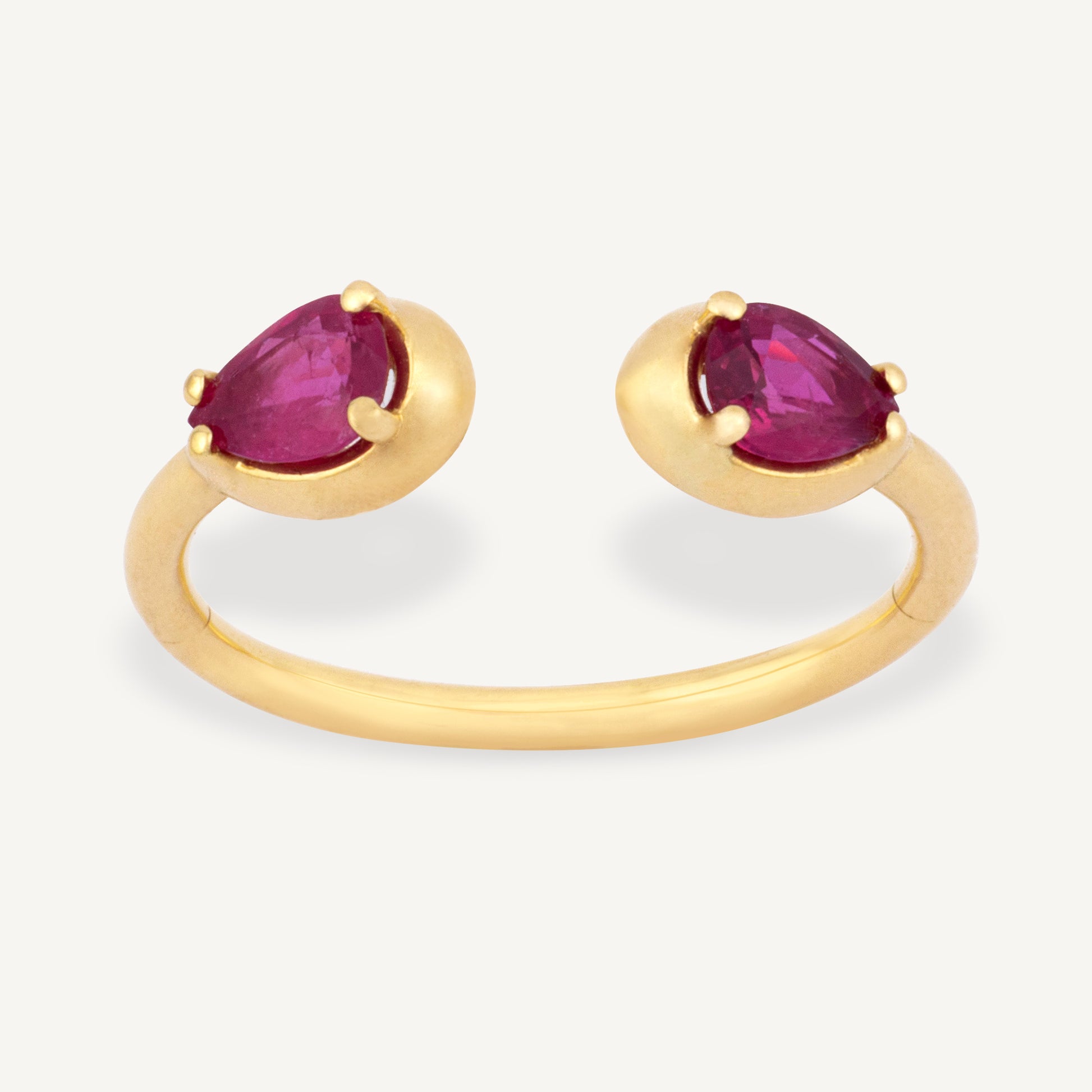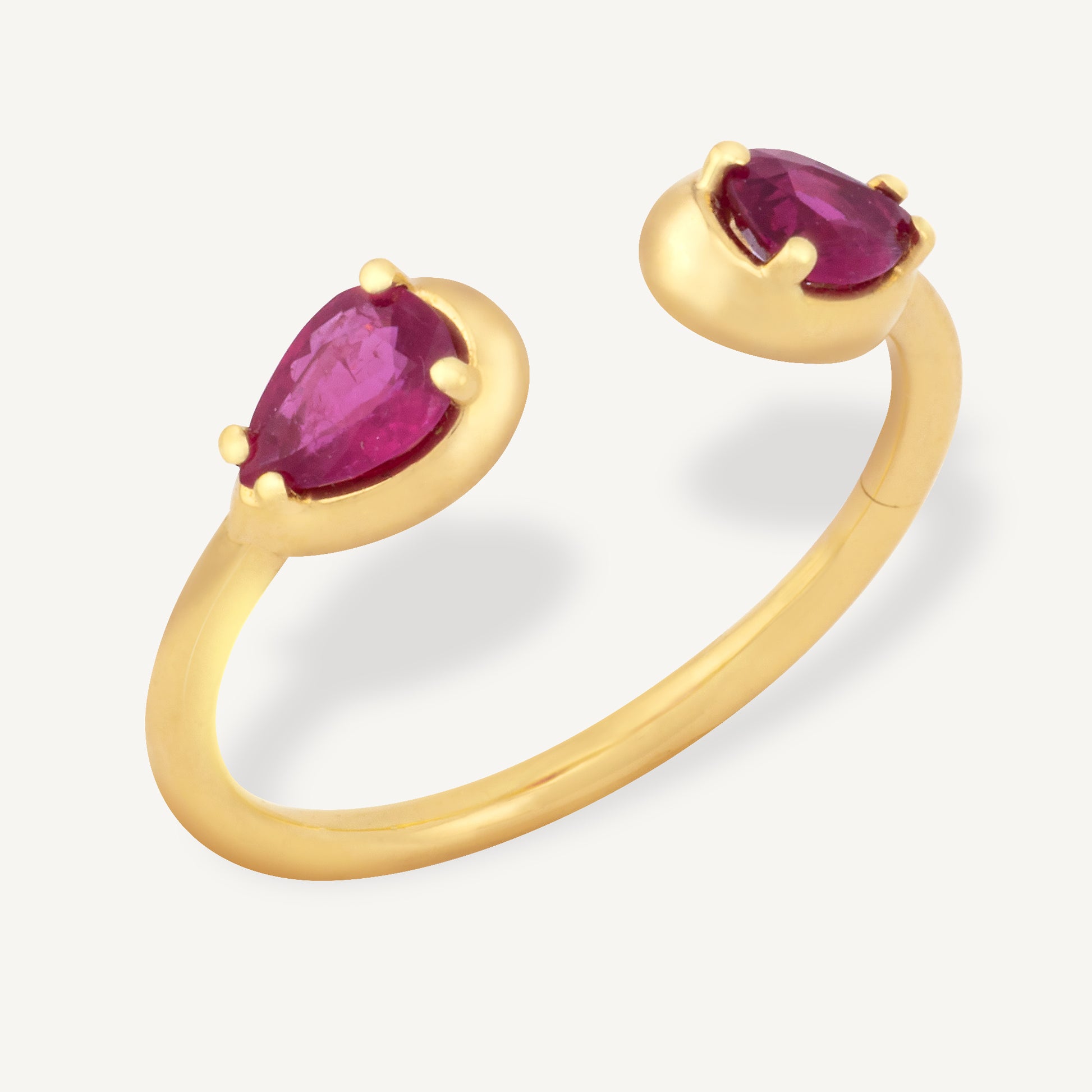 The 18K Yellow Gold Ruby Sparkle Open Ring showcases a unique open design, elegantly adorned with radiant natural red rubies. This exquisite ring combines boldness and sophistication, making it a striking statement piece for any occasion.