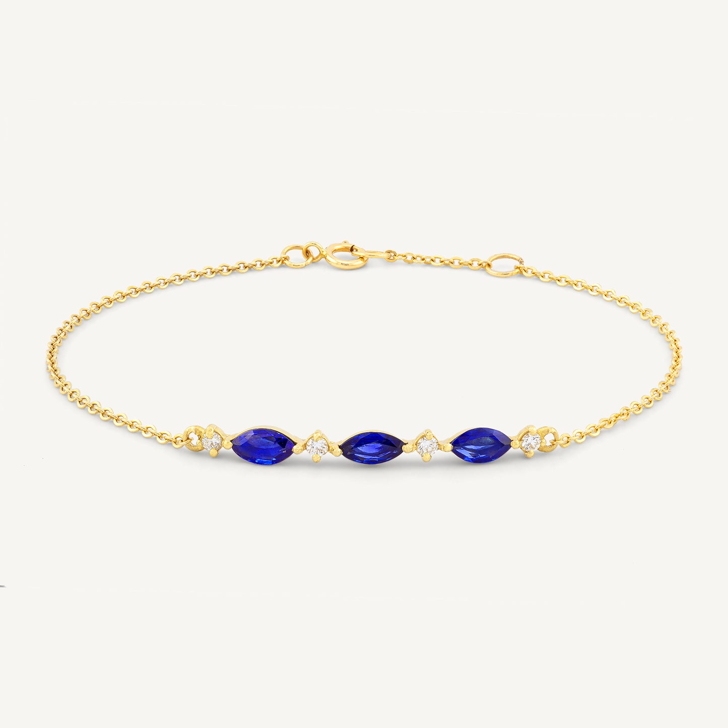 The 18K Yellow Gold Sapphire Serenade Bracelet features natural blue sapphires and sparkling diamonds. This elegant sapphire jewelry piece adds timeless sophistication and a touch of glamour to any outfit.